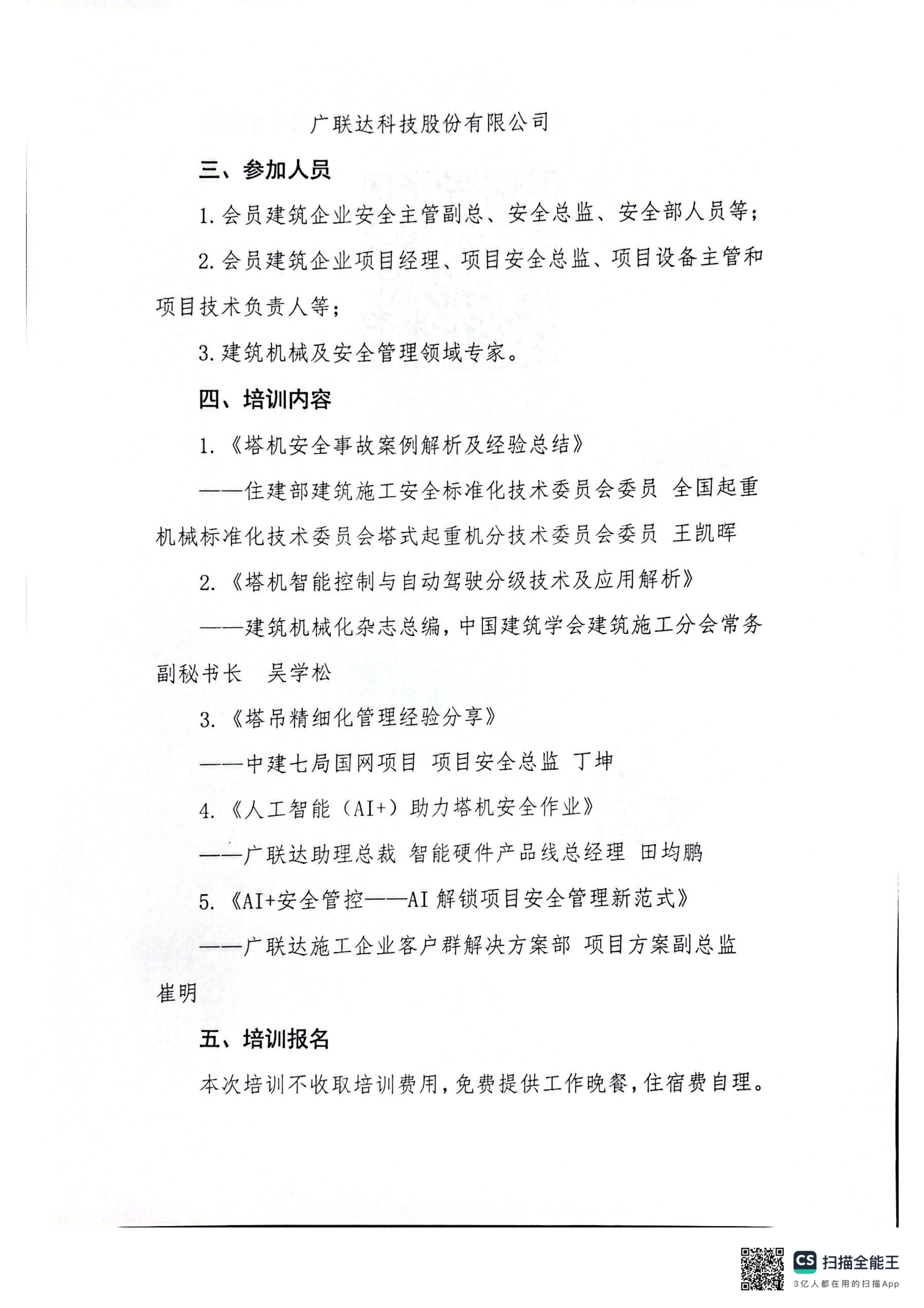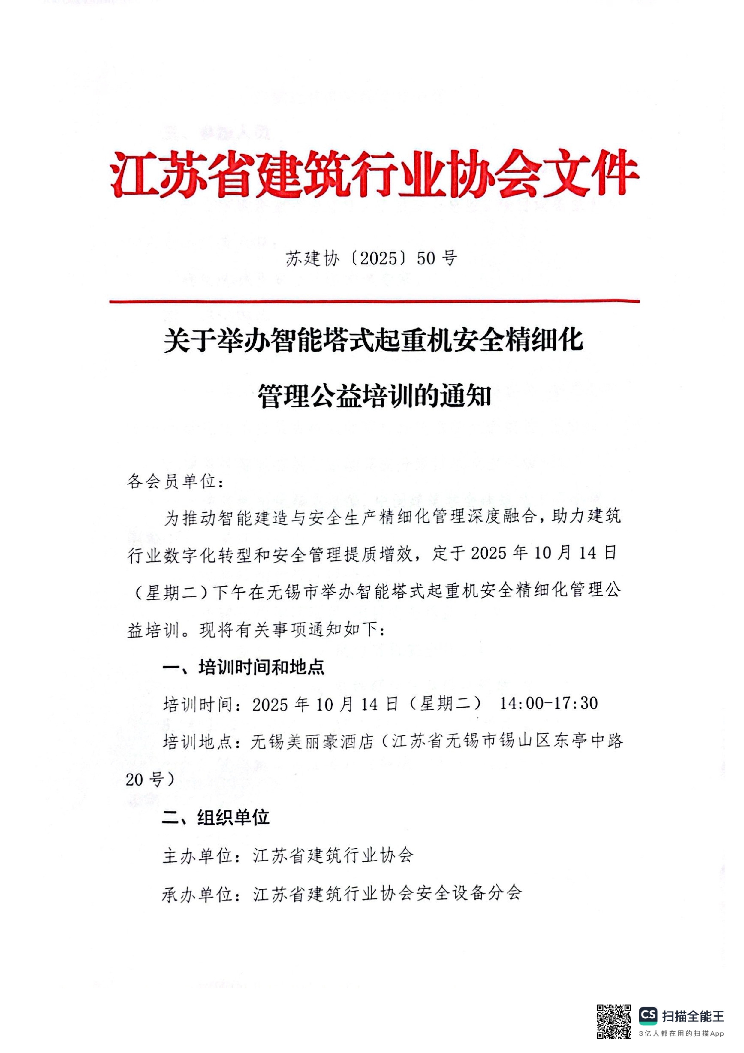 关于举办智能塔式起重机安全精细化管理公益培训的通知